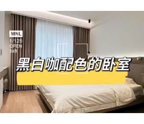 黑白咖配色的卧室真的绝美啊,床头原木色护墙板+床头柜