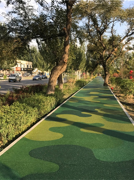 彩色混凝土透水路面的作用较多,一般包括:减少地表径 流、过滤补充地下水、改善生态与城市环境、吸声降噪几个方 面。相较于不透水路面,彩色混凝土透水路面可增加地表水人 渗量,降低地表径流系数,减慢雨水汇流速度,减少径流总量, 防止城市内涝。同时,有效补充地下水水位,降低地面下降概 率,并且,由于地表径流会携带污染物,进入自然水体后必然 加重自然水体污染,透水混凝土路面通过自身渗水路径维持 地下水稳定的同时削减径流污染。而采用彩色混凝土透水路 面铺装兼顾了人类活动需求,还能减轻对自然的破坏,有效保 护路面下的动植物、微生物的生存环境。彩色混凝土透水路面 具有与外部空气、下部透水垫层连通的多孔结构,垫层土壤中 丰富的毛细水通过自然蒸发和蒸腾作用可以有效缓解城市 “热岛效应”,改善城市热环境。加之其吸声降噪作用明显,在 多孔结构孔壁表面摩擦力和空气运动粘滞阻力的作用下,使 声波衰减,达到吸声降噪的目标